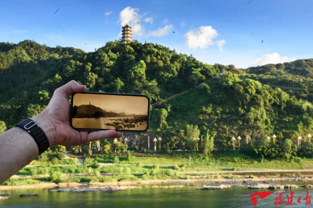 8月13日,查德威克在建溪畔展示90年前普魯默教授在同一位置拍攝的老照片。時光荏苒,景象幾無變化。